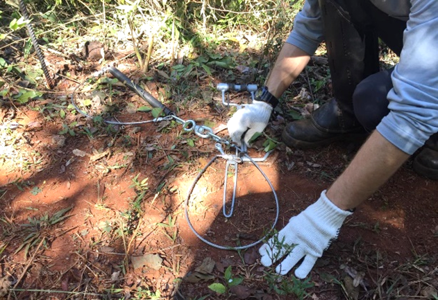 Já as armadilhas do tipo laço, quando corretamente instaladas e monitoradas, permitem capturas eficientes em trilhas de uso frequente sem causar ferimentos, desde que manejadas por equipes treinadas e preparadas para o atendimento imediato do animal.